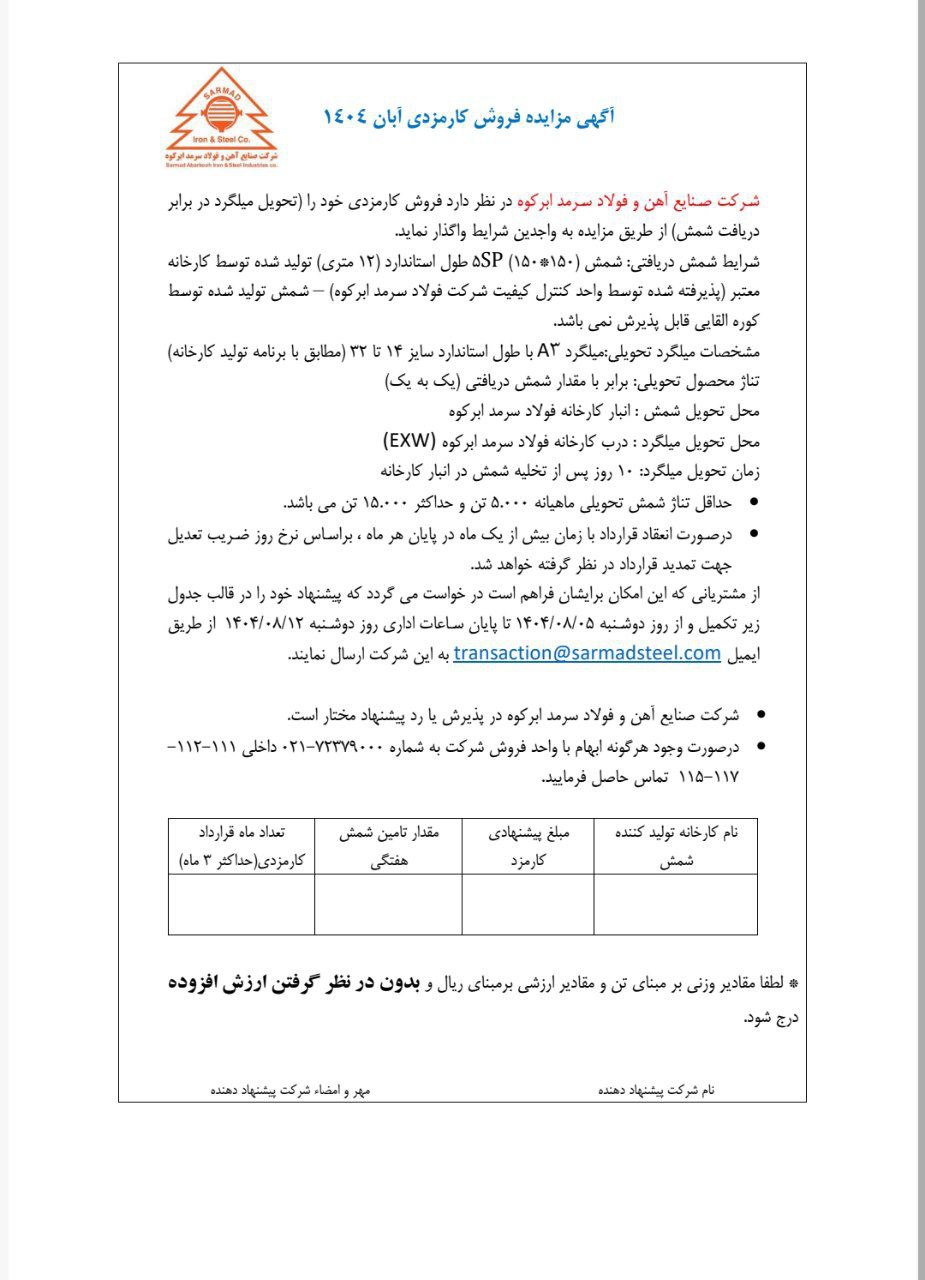 شرکت صنایع آهن و فولاد سرمد ابرکوه در نظر دارد فروش کارمزدی خود را(تحویل میلگرد در برابر دریافت شمش) از طریق مزایده به واجدین شرایط واگذار نماید.