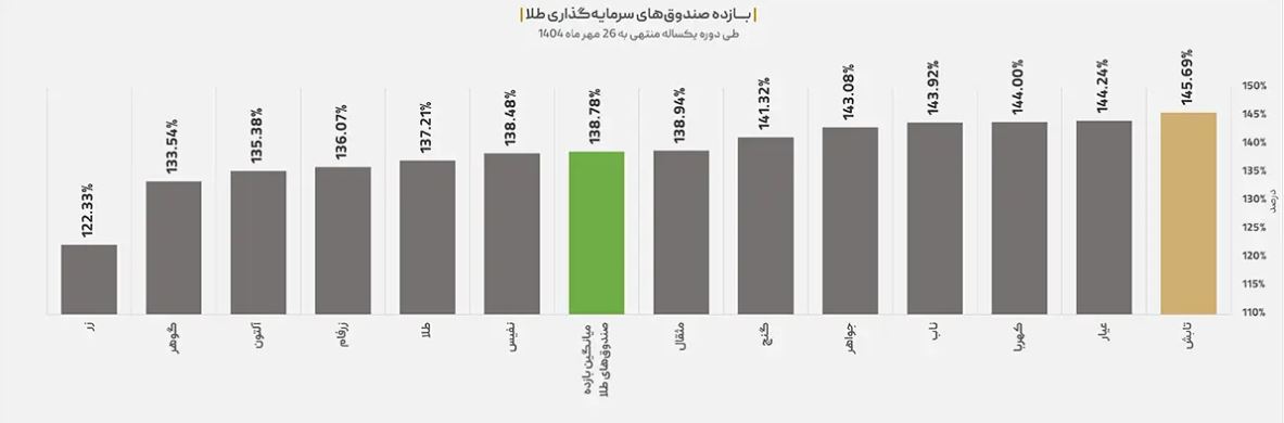 داده‌های این دوره یکساله حاکی از آن است که طلای ۱۸ عیار با ثبت بازدهی ۱۵۹.۶ درصد، پرچمدار مطلق بازارها بوده است؛ با این حال باید هزینه‌های پنهان معاملات آن همچون کارمزدهای بالا و مالیات هنگام خرید و فروش را در بازده اکتسابی لحاظ کرد تا به بازدهی واقعی آن دست یافت. پس از آن، صندوق‌های سرمایه‌گذاری طلا (که کارمزدهای معاملاتی ناچیزی دارند) با میانگین بازدهی ۱۳۸.۸ درصد، عملکردی درخشان از خود به جای گذاشتند و حتی از سکه امامی که بازدهی ۱۱۷.۳ درصدی را تجربه کرد، پیشی گرفتند. این عملکرد قوی صندوق‌های طلا نشان می‌دهد که ابزارهای مالی نوین توانسته‌اند به خوبی بازدهی دارایی پایه خود را دنبال کرده و به گزینه‌ای جذاب با نقدشوندگی بالا و امنیت معاملاتی بورسی تبدیل شوند.